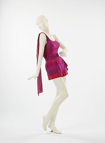 Schnurer's name became particularly synonymous with well-crafted playfully designed bathing suits. In this example from her "Flight to India" collection, Schnurer makes reference to the sari in the convertible shoulder-strap sash and slight hip ruffle, without actually modifying the basic bathing suit pattern. Using this production model of a basic silhouette with thematic flourishes, Schnurer was able to produce affordable yet distincitive new fashions season after season. The textile, which was made in several color ways, was used in a number of garments in the collection; it is based upon a cotton voile sari that Schnurer purchased in the northern city of Ahmedabad, the largest textile-producing center in India.
