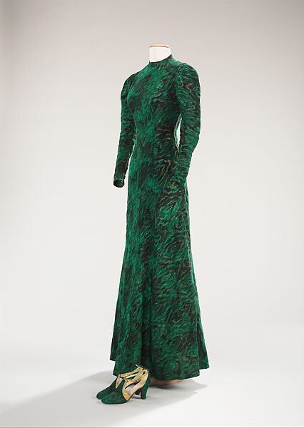 A characteristic Schiaparelli often employed in her designs is the use of unique and often intriguing textiles. This sleek dress, with matching shoes by famed shoe designer André Perugia, is a striking example of that design distinction. The many layers and shades of green in the print, similar in feel to ikat weave, produces depth and the additional metallic threads woven throughout lend a luminous quality, making the overall effect like sunlight shining over a mysterious forest. Millicent Rogers, the original owner of this dress, gave her entire wardrobe to the Brooklyn Museum, and throughout the almost 200 examples of Schiaparelli's work from Rogers' collection, this ensemble best illustrates Schiaparelli's love of unique fabrics as well as the close working relationship Schiaparelli enjoyed with Perugia, which lasted throughout her career.