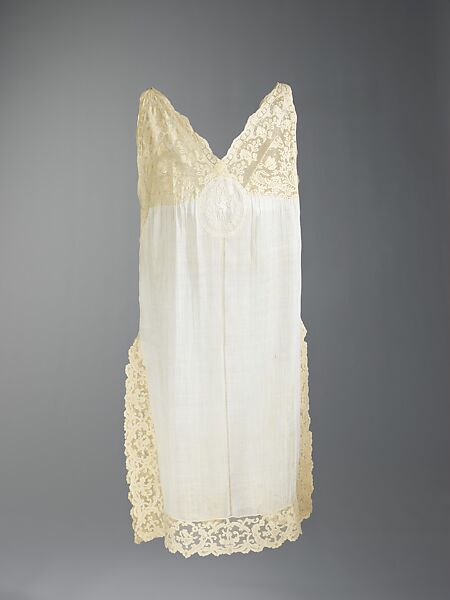 Rita de Acosta Lydig (1880-1929), a noted beauty and style icon of the early 20th century, owned this nightgown. Many of de Acosta Lydig's garments feature lace panels or trim which likely came from her extensive personal collection. In addition to two different types of fine lace trimming, this piece includes an oval medallion embroidered with in a distinctive figural style known as "nun's work," thought to be either French or Swiss in origin. The maker of this garment had a sense of wit; the inclusion of a cupid figure on such an intimate garment makes a statement about the wearer's proclivity for romance or, perhaps, seduction.