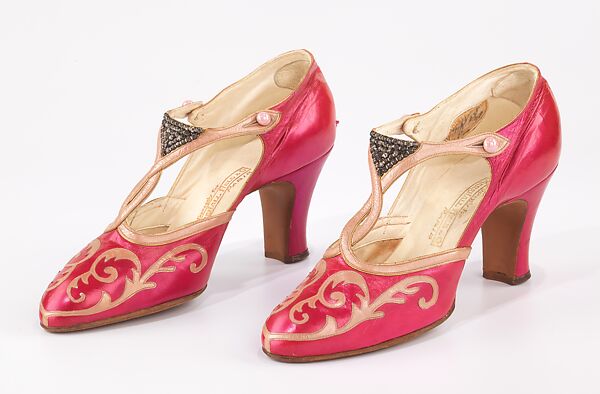 The Jazz Age is remembered as a period of unparalleled exuberance, due not least to contemporary fashion. Women's eveningwear in particular expressed this zeitgeist through uncomplicated cuts and bold uses of color, pattern, and glittering materials. Metallic leathers and lively appliqués were important elements in footwear designed to accompany the iconic "flapper dresses", however the fuchsia and peach pearlized leather of this pair of flamboyant evening T-strap shoes is extraordinary. To assure an eye-catching sparkle, the designer has included a panel of pavé rhinestones on the strap.