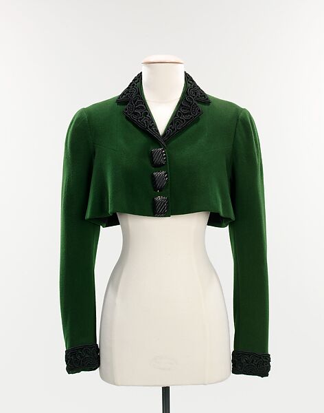 Worn by the inimitable Millicent Rogers, this jacket was designed for Schiaparelli's spring 1938 collection. The silhouette, particularly the curved seaming of the back, is reminiscent of the spencer jacket worn in the early 19th century. The buttons and the dense cord embroidery are an example of Schiaparelli's desire to use trim and decoration that was unusual. Schiaparelli forewent using traditional closures, such as hooks and eyes, concealed zippers or regular sized buttons. Instead, she used more artistic options, sometimes in recognizable forms, such as tree trunks or mermaids, other times simply oversized irregular forms, such as the buttons on this jacket. The cord is also particularly large, and not at all delicate, a subtle but intentional design detail. A belt in the Brooklyn Museum collection, also worn by Rogers, has a clasp identical to the buttons of this jacket (see 2009.300.3518) proving this jacket was designed as part of an ensemble.