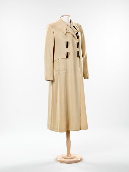 An early example of Schiaparelli's work and her predilection for audacious closures, this coat was worn by the endlessly chic Millicent Rogers, a devoted Schiaparelli client. The simple silhouette is enlivened by the buttons, in the form of bullet shell casings. Schiaparelli used creative materials and shapes for her closures, such as metal, plastic, ceramic and composition in the form of masks, gumdrops, pianos and leaves. The majority of her closures were objects that were not traditionally used as a closure, but became functional as well as decorative when used by Schiaparelli. Her work is characterized by an overall artistic quality, rather than strictly a fashionable vibe, and details on this coat such as the closures and the unique seaming on the pockets, make it a good example of that quality.