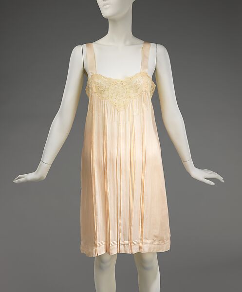 The extensive wardrobe of Millicent Rogers, a fashion trend setter, is part of the Brooklyn Museum's collection. There are several examples of exquisitely made lingerie in the collection, such as this lingerie set. Fabricated in a delicate, subtle peach crepe de chine, and trimmed with hand-made lace, this piece is of particular interest because of the fine workmanship and extraordinary details. There is a discreet monogram that measures 3/8 inch high, barely discernible with the naked eye, that reads "MM" for her given name, Mary Millicent. The variation of the monograms seen on Rogers' lingerie in the collection illustrates that clients would have been given choices in style, size and form of the monogram to customize each piece they ordered. The details, such as the hand-done fagoting and piping at the top edge of the waistband channel, signify fine workmanship.
