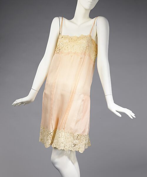 Exquisitely detailed in its decoration, this hand-made teddy was owned by Millicent Rogers, the style maven whose entire wardrobe is in the Brooklyn Museum’s collection. The delicate, fine quality lace contrasts gently with the faint peach crepe de chine. The hand worked details such as the tucking, the drawnwork bands, which overlap with the lace at the bodice top, and the lace, which is applied following the line of the motif, are refined and typify the level of taste and appreciation of beauty Rogers expressed in her clothing. The diminutive monogram, "MM" for her given name Mary Millicent, is the epitome of customization and luxury.