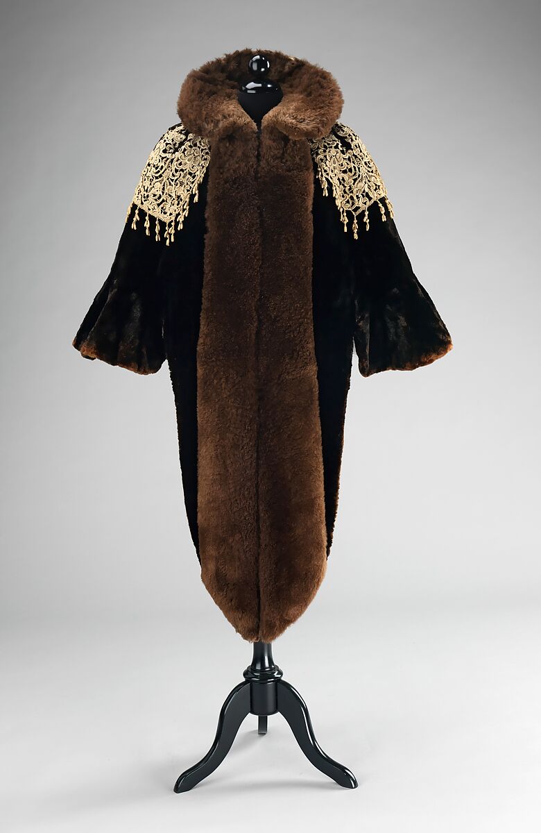 Worth's facility for working with fur is evidenced in this unique mantle. The graceful folds at the back and the collar flowing into the elongated front panels make this a phenomenal piece. The appealing pattern created by the lace enhances the overall silhouette and emphasizes the beauty of the fur.