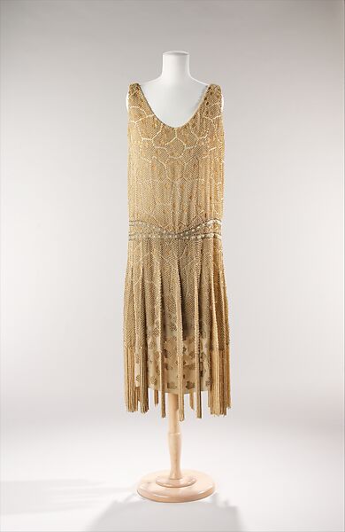 A flapper's dream, this mid-twenties design is the epitome of luxurious frivolity. The beading and handwork is immaculate, the color subtle but the number of embellishments extravagant. The long strands of beads, clustered around the bottom of the skirt, give movement to the dress that would no doubt cause a stir as the wearer danced the night away.