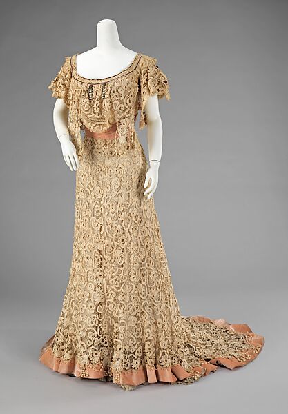 Dresses with Irish crochet lace were very popular during the Belle Époque. This example of a full-length evening garment fashioned from that lace is given a level of three-dimensionality from the use of lace and pendant balls. They add surface interest, as does the arrangement of the ball fringe over the peach velvet hem band.