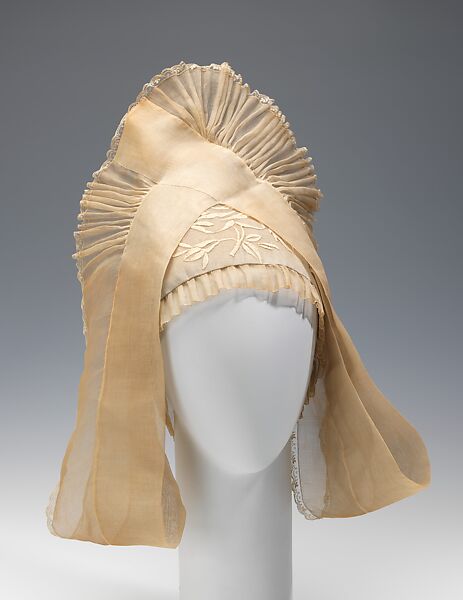 Lanvin's roots as a milliner are evident with this delicately stitched headdress. The design is influenced by the coif, a style of traditional folk headdress. The original coif was a basic cap which covered the ears and was worn throughout Europe since the Middle Ages. The French form adapted into a shape worn by women that covered the bun at the back of the head and extended at the top and down the sides of the face. This style was traditionally made in white, much like this couture adaptation. This headdress' intricate pleating and unique shape make it exemplary of Lanvin's artistic ability.