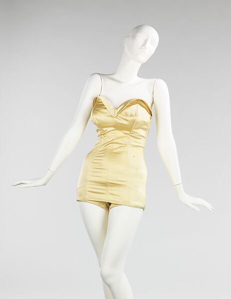 This bathing suit is one of the rare examples in the Brooklyn Museum collection of Schnurer's non-culturally inspired designs. The gold lurex fabric and classic line illustrates the wider pantheon of her design repertoire and are characteristic of Schnurer's bathing suits throughout her career. The double-layer trunks indicate however that the suit is likely from a summer collection from 1949 or 1950.