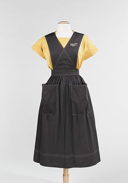 This work dress is functional for the kitchen as well as the dining room of a restaurant. The utilitarian apron has large pockets at front and provides full coverage of the dress underneath, keeping it clean during cooking. When the apron is removed, the cheerful yellow dress is appropriate attire for waitressing. Cookman designed a practical uniform and added a sense of style through her color choice, noticeable topstitching and shiny silver buttons.