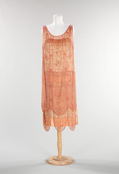 This evening dress is an excellent example of the period. The 1920s was the era of the flapper and her nights were spent on the town, dancing and sipping cocktails. This dress has a more refined and interesting appearance because of the varying hues of pink in the surface decoration, which shows certain levels of quality in its workmanship. Having the tabard open at the sides is an interesting detail in that it shows off the decoration of the garment underneath, yet it is attached at the sides to control the movement of the floating panels underneath. To complete the dress, the scallops of the tabard mirror the petals of the underdress.