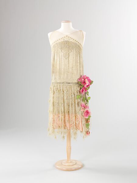 The tubular silhouette of the 1920s allowed for a variety of short, beaded dresses, perfect for an evening out. This French garment is of the finest quality, complete with highly refined decorations. The combination of gold lamé and variously shaped iridescent sequins create an interesting surface texture, enhanced by the three-dimensional flowerheads applied to the petal panels of the overskirt. A harmonious design, the cascading flowers tone perfectly with the pink hem of the underslip and the V-neck matches the configuration of beadwork on the bust. Overall, this is an exquisite garment, extremely luxurious for this decade of frivolity.
