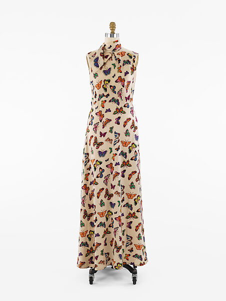 The butterfly was the Surrealist symbol for change, particularly the change from ugly to beautiful. As the unlovely caterpillar morphs into the brilliant colorful butterfly, so Schiaparelli's designs could transform the ordinary into the extraordinary. Many of her clients were women who did not possess the accepted standard of beauty, but rather a more striking sort of chic, such as the Duchess of Windsor and Millicent Rogers, and Schiaparelli's artistic designs were perfectly suited to assist in developing their particular versions of style and beauty. This evening dress design from the summer 1937 collection features a lively butterfly print, most likely made exclusively for Schiaparelli that expresses the wide array of types and colorations of butterflies and was inspired by Surrealist artists such as Salvador Dalí, Max Ernst and Man Ray. Schiaparelli shared many Surrealist views with these artists and often used her designs as a means to express these views. Besides the act of using the Surrealist symbol for change as the subject of the print, using an insect as decoration for evening wear, an unexpected choice in itself, is also surrealist-inspired. The neckline treatment is an example of Schiaparelli's playful yet sculptural design sense and assists in giving the dress its compelling visual appeal. Schiaparelli featured the butterfly print on other pieces in her summer collection as well, including parasols (see 2009.300.1224), silk evening dresses (such as this) and her new waltz-length evening dresses.