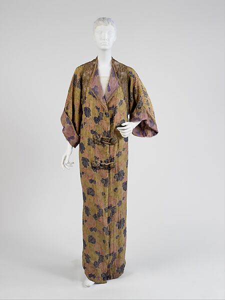 This Poiret coat is a unique cultural and period blend of references drawn from the Japanese kimono in its shape and a textile which resembles Victorian wallpaper. Early Poiret designs, such as this one, utilize exaggerated narrow lines to emphasize the corset free silhouette which he supported throughout his career.