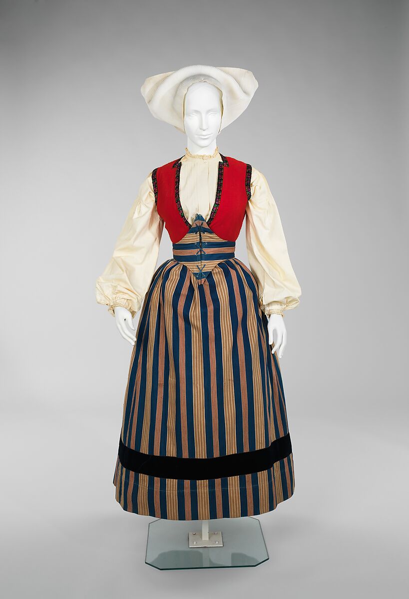 This ensemble, known as a bunad represents the national dress of Norway. The form is based on traditions established in the 19th century, and unique to each region. Bunads can be quite expensive due to the high quality of materials and craftsmanship in their construction.