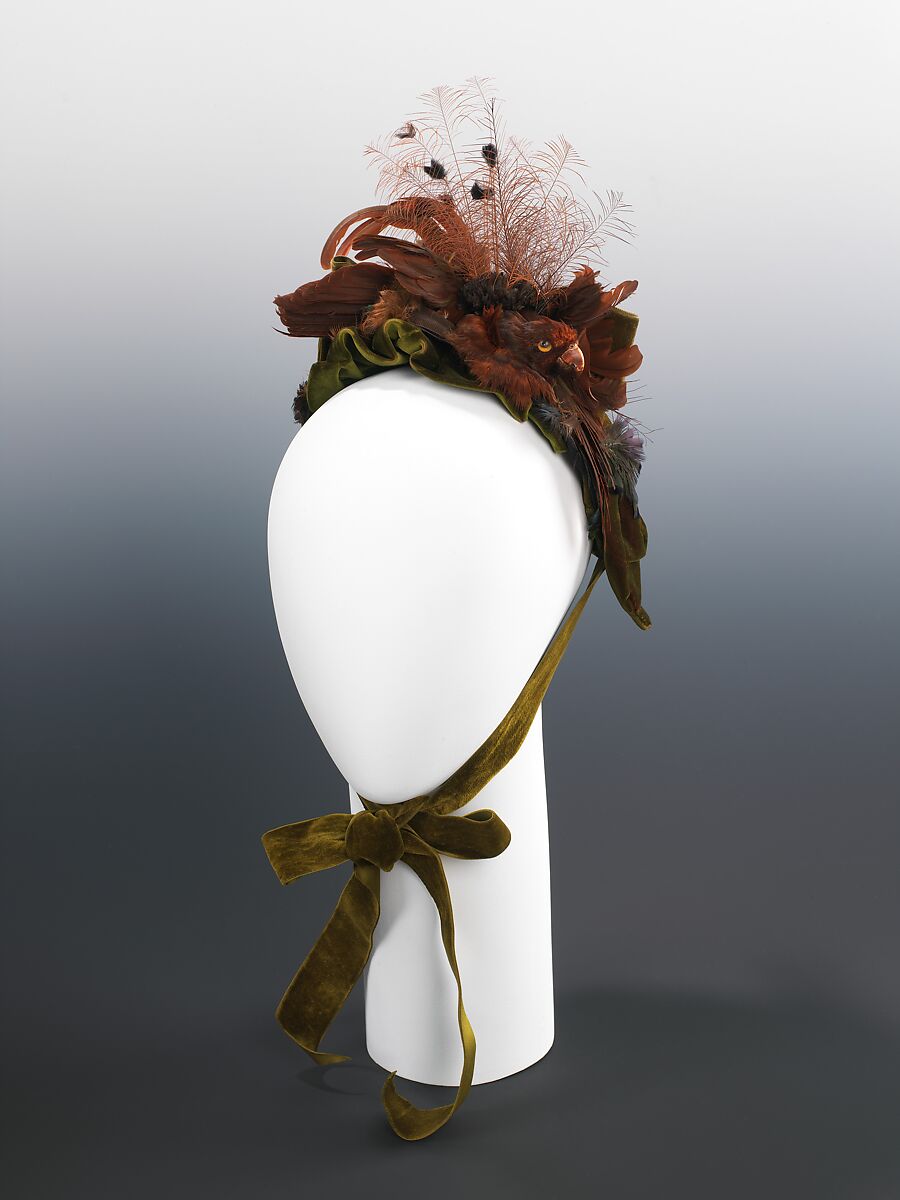 The use of feathers as a decorative element, rather than as stuffing, is a relatively new idea in the 1870s; by the 1880s the whole bird becomes a prevalent feature. The dark rich colors in a variety of shades echo the upholstered decor of the period.
