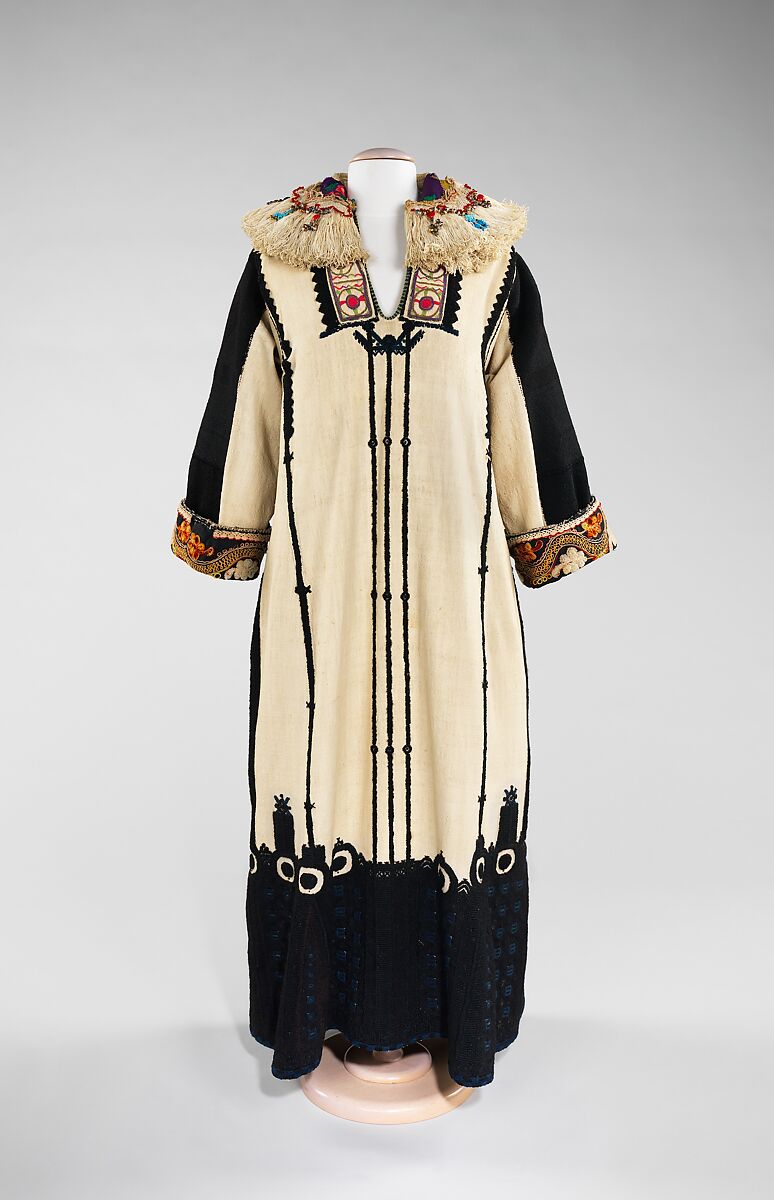 The graphically bold designs on this Serbian dress create a visually stunning garment with a substantial presence. The use of heavy cloth makes the garment warm while also rendering it suitable for heavy ornamentation. Motifs include symbolic elements at the hem, with fertility goddess figures at the sides, and shamanistic-like ornaments on the collar.