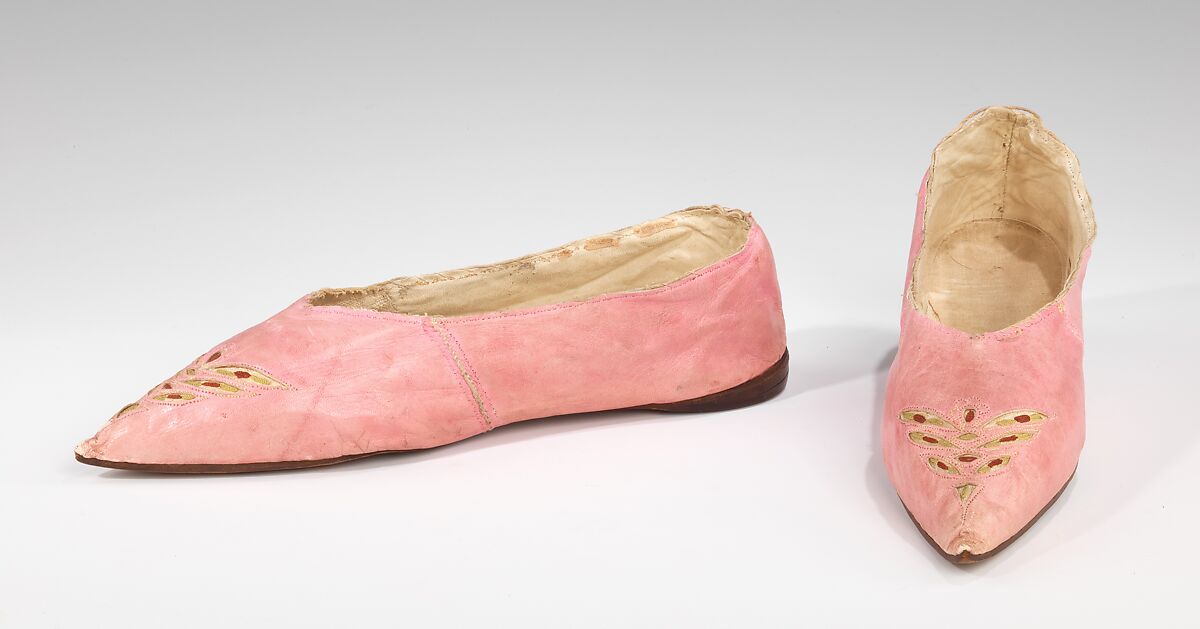 This attractive pair of pink kid slippers is typical of the bright colored shoes worn with the plain white dresses of the early 19th century. The cut-out design, here surrounding simple chain-stitched motifs on fabric but often found over plain leather in a contrasting color, was widely seen at this time and was meant to emulate the slashed ornamentation of Tudor dress. Also of note is the evolution to the heelless shoes of the 1810s by the use of a simple, low wedge heel. This style of upper is also frequently found with a small "Italian" heel, showing a certain degree of latitude in the fashionably acceptable choices.