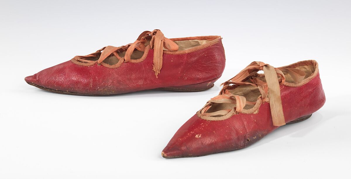 At the end of the 18th century, fashionable Europeans turned to ancient Greece and Rome for inspiration. Women's dress was radically simplified in emulation of historical styles, and numerous fashions developed which made reference to those of the past while maintaining at least some regard for the contemporary standards of decorum and functionality. These "sandals” were inspired by Classical footwear and would have complimented the neoclassical fashions of the period. While what we now think of as a sandal (a sole secured to the foot with straps) is documented in a few illustrations from the Neoclassical period, the wearing of such flesh-baring footwear was considered by most to be beyond the limits of decency.