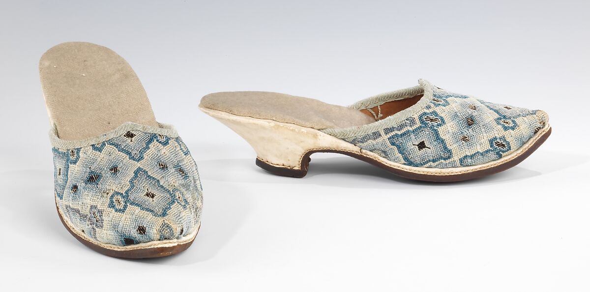 Mules were a popular form of at-home footwear in the 17th and 18th centuries for both men and women. This fairly conservative example of ladies' mules features a low heel and good quality embroidery in tastefully subdued tones. This style of embroidery is known as Florentine work, a type of flame stitch canvas work with varied stitch lengths.