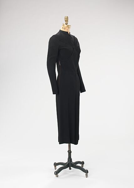 Schiaparelli was known to embellish her simple silhouettes with provocative textiles, such as this subtly glimmering dress fabric from spring 1938. The metallicized effect is accomplished by weaving one light-reflective thread with a matte thread. The frizzy texture of the yarns is also unusual and adds an additional textural element to the textile. The plastic zippers used are a classic Schiaparelli detail. Here she has boldly used two different colors, brown on one side, black on the other, to humorously add interest. The welt seaming on the bodice hints at her trompe l'oeil bow sweaters from her first collection in 1927. The seaming is also a predecessor of the seams on the Surrealism-inspired "skeleton" dress from her summer 1938 collection. In this example, they remind the viewer of a spindly, yet fashionable, web capturing the wearer.