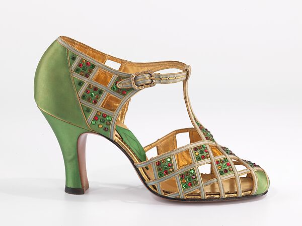 Herman Delman (1895 -1955) is remembered as the great showman of the New York footwear industry. Targeting wealthy socialites and celebrities as his customers, Delman opened a small custom shoe shop on Madison Avenue in 1919. Gradually shifting his attentions to manufacturing, Delman hired top designers, most notably Roger Vivier, to create finely-crafted, chic and luxurious footwear in stand-out designs. Delman was a savvy promoter who realized that product image was paramount. He pioneered the practice of featuring film stars in his advertisements and partnered with exclusive clothing stores, including Saks and Bergdorf Goodman, to distribute his shoes. Contrary to common practice, Delman insisted that his name appear in every shoe he manufactured, thus securing his company's reputation and success. This evening shoe features the open sandal-like upper typical of the period in an elegant design and attractive color combination.