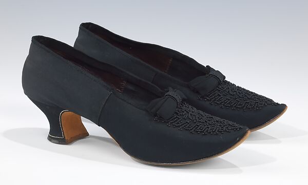 All the features of French shoemaking at its highest - top quality material, meticulous hand craftsmanship, and refined design - are exhibited by this nearly pristine pair of evening pumps. The vamp features an attractive beadwork design, dense but well articulated. The extreme toe shape and curved sole are peculiar to Parisian shoes at this time, and together with the high cut of the back and throat, produce a perfectly straight line along the top profile.