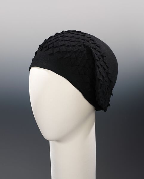The cloche was a popular headwear form for the 1920s and into the 1930s as it suited the hairstyles and silhouettes of the time. Sleek, form-fitting and aero-dynamic, it echoed the aesthetics of the Art Deco period. The idea of speed, and advances in industrialization became dually evident in fashion. In addition, the refined cutting and piecework incorporated in this example, displays the sharp geometric lines also associated with the Art Deco period.