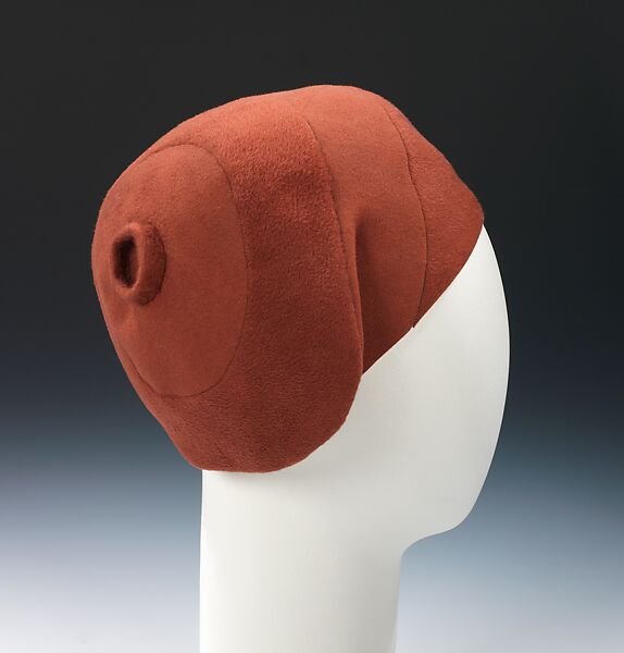 The piecing and geometric form incorporated in the construction of this hat is representative of the transitional period at the end of the 1920s into the 1930s. Fashion moved towards a more sleek and streamlined silhouette. With the lengthening of hemlines, came the lengthening of the bobbed hair of the twenties. Glamour took precedence over the 1920s gamine, and a softer, more seductive and wavy hairstyle, or "finger wave", worn close to the head was favorable. The headwear of this period, incorporating draped fabric similar to the style of a turban, began to move towards a more form fitted shape that exposed the face.