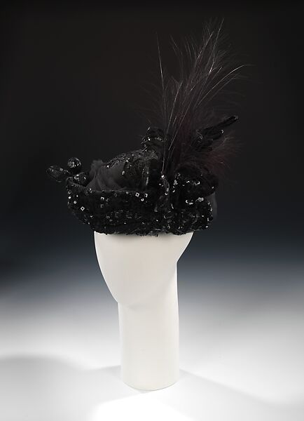 The museum's collection contains a number of ladies' hats spanning a thirty year period from the Brooklyn firm of West's, which was established in 1853. These hats come from three donors, each of whom gave multiple West's hats to the collection and no other milliner in greater quantity, suggesting that this was a business with a well-established aesthetic and variety of merchandise which could secure a loyal clientele. The innovative and robust quality shared by all of the West's hats supports this suggestion. In this toque, an elaborate combination of materials, including various shapes of sequins, paillettes and beads, is employed to create a glamorous effect. The highly textured and glittering surface is complemented by the vigorous burst of egret feathers.