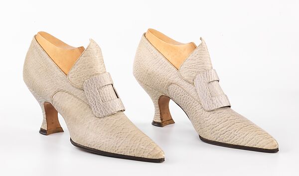 With the emergence of short skirts in the later 1910s and 1920s, shoe design suddenly became much more important to fashion. Designers offered a variety of new ideas in a greatly expanding vocabulary of materials. This pair of shoes features the then-fashionable Colonial style in an extremely unusual and eye-catching blue-grey crackle patterned leather. Preserved as a sample by the Charles Strohbeck company, they are perhaps better interpreted as what was possible at the time, rather than what was actually manufactured. The distorted shape of the last exemplifies the extreme style seen around 1920: elongated and narrow lines, extremely pointed toe extending flat on the ground, and high narrow arch breaking in a sharp angle at the ball of the foot.