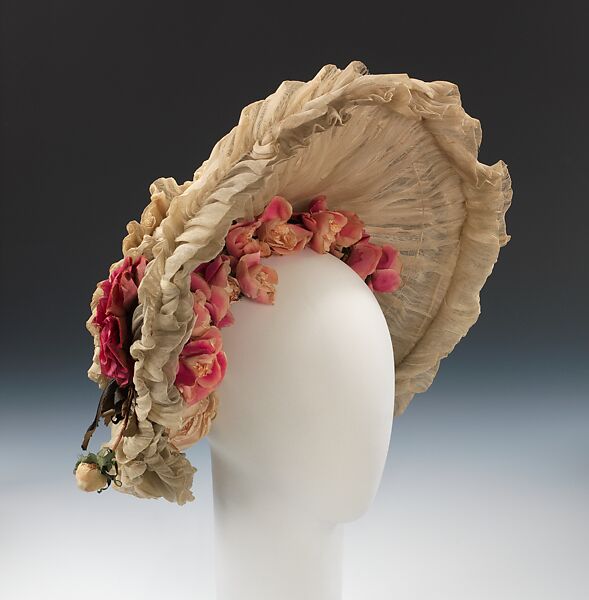 The contemporary taste for frilly, ornate, and ultra-feminine styles is fully expressed in this hat from the middle of the Edwardian era. The placement of flowers under the brim is a charming and flirtatious feature of hats of the period, and this hat features particularly large and prominent flowers, calling attention to the wearer's face in a ruffly halo of shirred sheer cotton. The flowers are beautifully made, realistic and varied in type, adding to the quality and appeal of the object.