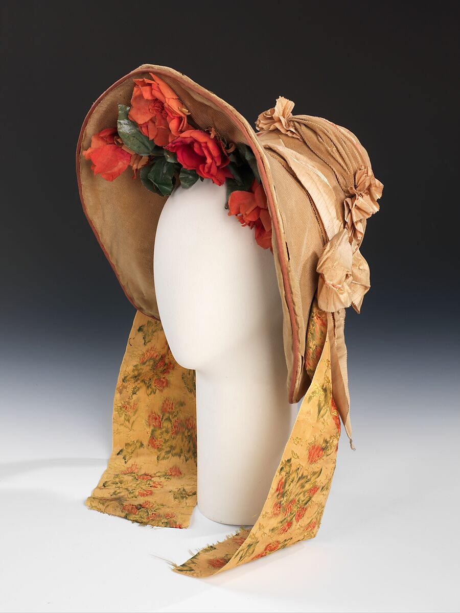 1837 was a pivotal year in fashion, when the large sleeves collapsed and the shoulder greatly decreased in size. Bonnets also gradually changed shape after that date, their exuberance giving way to more demure bonnets with narrow close-fitting brims that hid the face.
