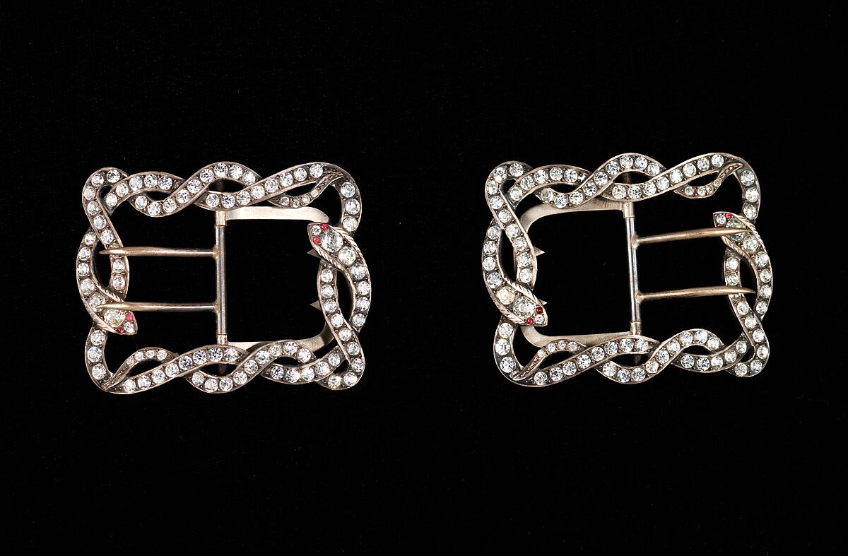 Since medieval times, shoe buckles have been a prominent part of a lady or gentleman's ensemble. During the 17th century, their popularity and decorative nature increased. This beautifully designed pair from the late 19th century illustrates the dominance of the trend over the centuries. The intriguing imagery of the snakes slithering themselves around the buckles is both subtle and highly decorative. It would require a second glance to notice the red paste eyes and the tapered tails. The fine detail required to execute the intertwining forms with graduated stones demonstrates fine workmanship.