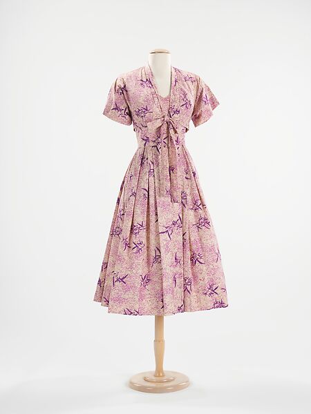 This sun dress ensemble from Schnurer’s “Flight to Japan" collection incorporates multi-layered kimono styling that enhances the graceful line of the neck. Strikingly uncomplicated necklines were a key Schnurer design element, which allowed the wearer greater self-expression in accompanying jewelry and hairstyle. The simple elegance of this dress is carried out in the delicate purple and lilac bamboo print.