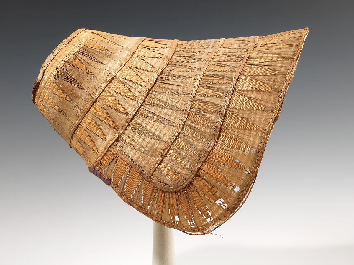 Because of its inherent fragility, the intricate fancy weave worked on this bonnet is rare, as examples like this usually do not survive. The striking color and design of the straw added an additional decorative touch to the bows, corsages, and ruffles that would have originally decorated the bonnet.