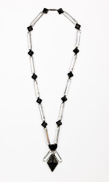 In graphic black and white, this Art Deco necklace radiates modernism. Art Deco design was based on mathematical and geometric shapes, and this sleek necklace combines the two variously shaped angular faceted elements to create a sophisticated piece of jewelry. The stark color combination and simplicity of the elements is visually impressive. The necklace was owned by legendary actress Lauren Bacall, who gave many pieces from her personal wardrobe to the Brooklyn Museum.