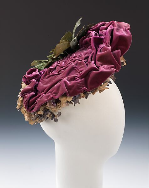 The sovereignty of the leading Parisian milliners is exhibited in this whimsical creation, where mastery of technique, concept, materials, and creativity are brought into full cooperation. While working within the expected media and vocabulary of the time - velvet manipulated to give shape and texture, trimmed at the side and underside with artificial flowers - the designer has beautifully integrated the shape, color and form to give the impression of a large cabbage rose.