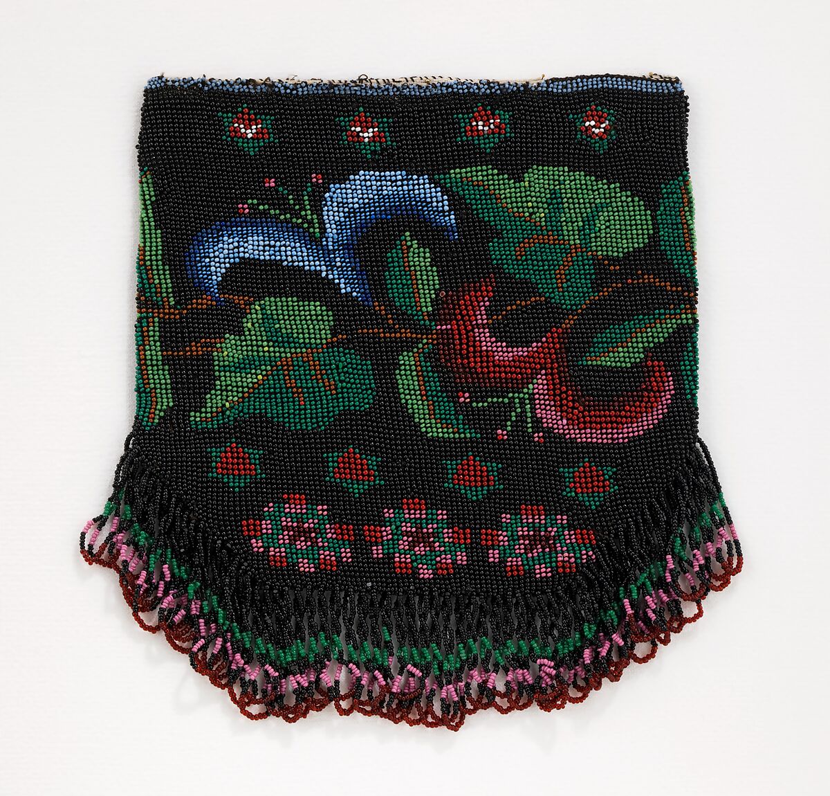 The well-executed design on this pouch bag includes a naturalistic depiction of lilies executed by varying the size and color of the beads. The twisted and colorful loop fringe is exceptional.