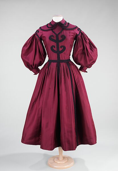 Millicent Rogers, the original owner of this ensemble, was a woman of great personal style. She often worked closely with designers to infuse her own sartorial aesthetic into her clothes, including touches authentic to her most current surroundings. This particular ensemble by Mainbocher is an example of the custom designs Rogers enjoyed wearing. The 1830s, the Biedermeier period, held particular fascination for Rogers, as this design illustrates. It is one of three examples in the Brooklyn Museum's collection by Mainbocher for Rogers inspired by the 1830s (see 2009.300.788a, b). Rogers began to collect Biedermeier furnishings during her years in Austria before World War II, and upon her return to America at the onset of the war, she decorated her home in Virginia, Claremont Manor, built in 1750, with Biedermeier furniture. This Mainbocher creation is a unique example of Rogers' working relationship with many designers and her inimitable sense of style.