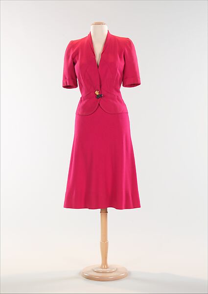 The color of this suit, Schiaparelli's signature Shocking pink, was dubbed thus because it represented her desire to shock those around her with her unique and sometimes avant-garde designs. Her goal was to design clothing and accessories that possessed an artistic aesthetic, rather than the more conventional idea of fashion and beauty. The textural novelty weave Schiaparelli used is an example of her propensity to use interesting fabrics to enliven a simple silhouette. The quirky mermaid ornament is typical of her sense of whimsy and was probably executed by an artist such as Jean Clement or Roger Jean-Pierre who often executed her button and ornament designs.