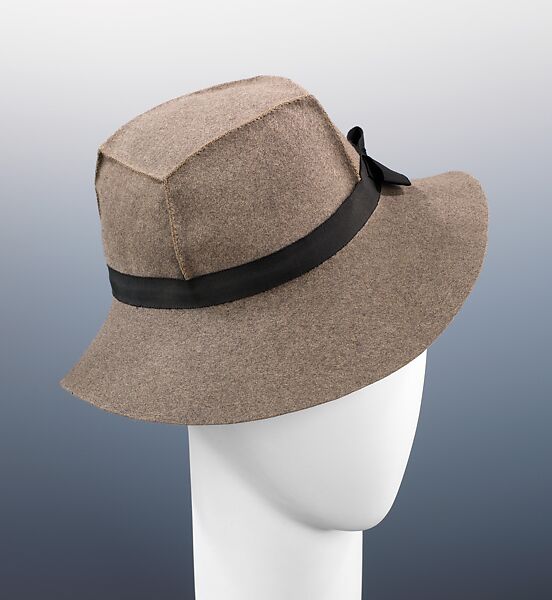 A perfect accompaniment for the man-tailored architectural suits favored by the 1930s woman, this architectural hat combines geometry and asymmetry in one fashionable design. The non-conventional construction, particularly of the crown, is demonstrative of Victor's innovative and whimsical aesthetic. Victor has taken the masculine fedora form and wittily executed it in bankers gray felt, commonly seen in men's suits. Many women’s hats of the period were sweetly feminine, incorporating flowers, veiling and bright colors, and, with this design, Victor offers an alternative to the ultra feminine styles.