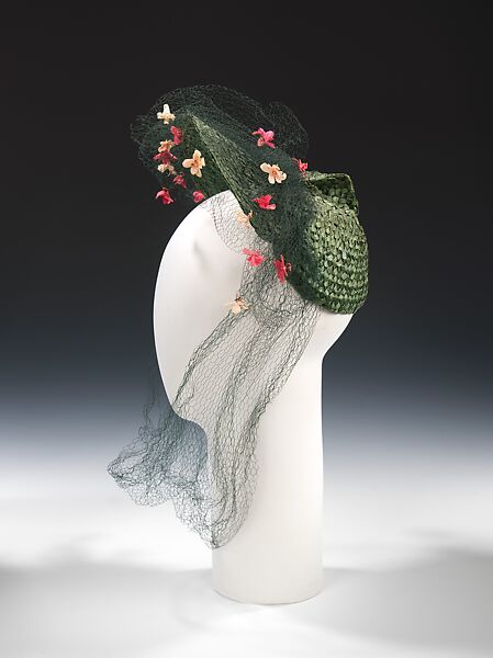 Victor uses common millinery materials in this example, straw and veiling, in fresh, vibrant green tones, creating an enlivened design. She sprinkles the veiling with feminine, brightly colored flower heads, lending a delicate air to the woman who wore it. Veiling usually covered the face, but here Victor uses it as decoration and to secure the straw form to the head, an example of her innovative design aesthetic.