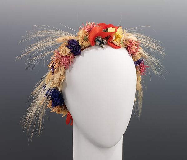 The ever fashionable Millicent Rogers was a client of both high end and mainstream fashion. Having homes in both the United States and Europe, she took great interest in the cultures around her, incorporating their traditions and styles into her dress. The headband featured here is a wonderful example, for it is reminiscent of European head wreaths that were worn as a part of traditional folk costume.