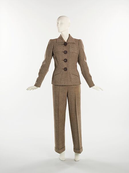 During the 1930s, it was very uncommon to see a woman wearing pants. Suits offered by couturiers almost always consisted of jackets and skirts. Pantsuits exuded a masculine sensibility, and although some designers offered versions of bifurcated skirts, with the aid of extra fabric they essentially looked like skirts. Although such Hollywood stars as Katharine Hepburn and Marlene Dietrich (a frequent Schiaparelli client) wore pants during the 1930s, pants and pantsuits were not considered acceptable for women until the 1970s. Only the most unconventional designer would offer a straightforward pantsuit, and only a fearless woman would wear it. This suit, from the late 1930s, was worn by Millicent Rogers, a stylish client of Schiaparelli's who possessed an enviable level of fashion bravado and owned several Schiaparelli pantsuits that are also in the Brooklyn Museum collection. A good example of Schiaparelli's tailored jackets, which she was known for, the orientation of the pockets is also reminiscent of the "desk" suit jacket made for the winter 1936-37 collection in collaboration with Salvador Dalí. The oversized leather buttons are an example of Schiaparelli's practice of using unexpected closures, and in this case, in a material not commonly used for buttons.