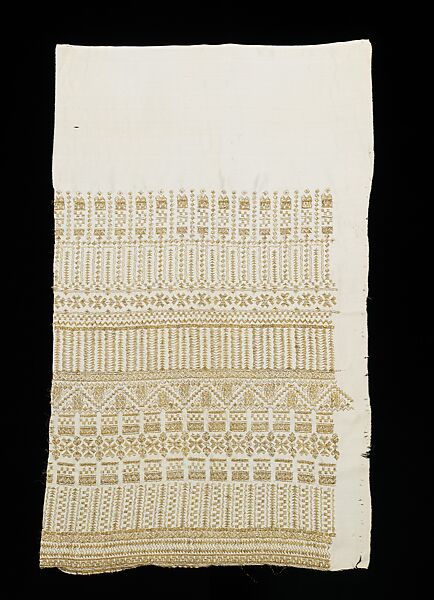 During the 1920s, so-called Egyptian shawls were in high demand and were made in Egypt for the Western market. They were often made of a sheer light-weight fabric and were embroidered with hammered metal foil in geometric designs. This embroidered example from Crawford's collection is very similar to the Egyptian shawls in both motif and technique. This embroidery is not couchwork, which is more common with metallic threads, thus making the embroidery even more unique. The dense intricate work would have been very costly and labor-intensive and would have been suited for an ephemeral dress decoration.