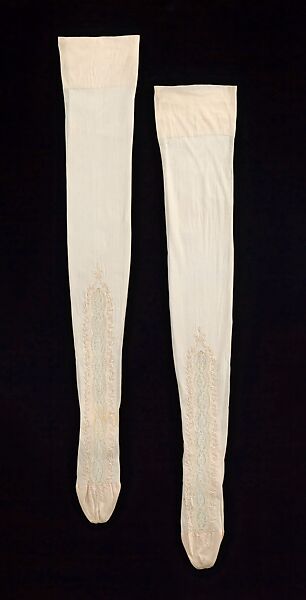 Stockings, originally designed for practical purposes, soon transformed into a fashionable accessory with the invention of the knitting frame in 1589 and then the circular-knitting machine in 1816. This technology allowed for a tighter weave and a better fit. Also, it was much easier to produce stockings, making them more affordable and readily available to a larger public. Plain white stockings were in mode for quite some time, until the mid to late-1800s when hemlines rose, and the ankle was revealed. This change in fashion called for colorful and fanciful motifs to decorate the lower leg, a visually appealing effect.