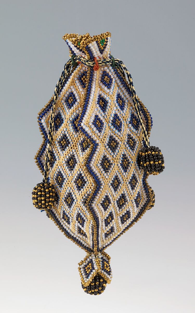 The unusual shape of this early miniature reticule suggests that it served a decorative, rather than functional purpose. Probably hand knitted, it is part of the Mexican beadwork collection of over 600 pieces assembled by Elizabeth Morrow (1873-1955), mother of writer Anne Morrow Lindbergh, the wife of renowned aviator Charles Lindbergh. Morrow collected the objects between 1927 and 1930, when her husband, Dwight Morrow, Sr., served as U.S. ambassador to Mexico. She lent the collection to the Brooklyn Museum in 1938 and upon her death, her children donated it. A collection of 155 pieces of Mexican ceramics and other decorative arts were given to Amherst College, her husband's alma mater.