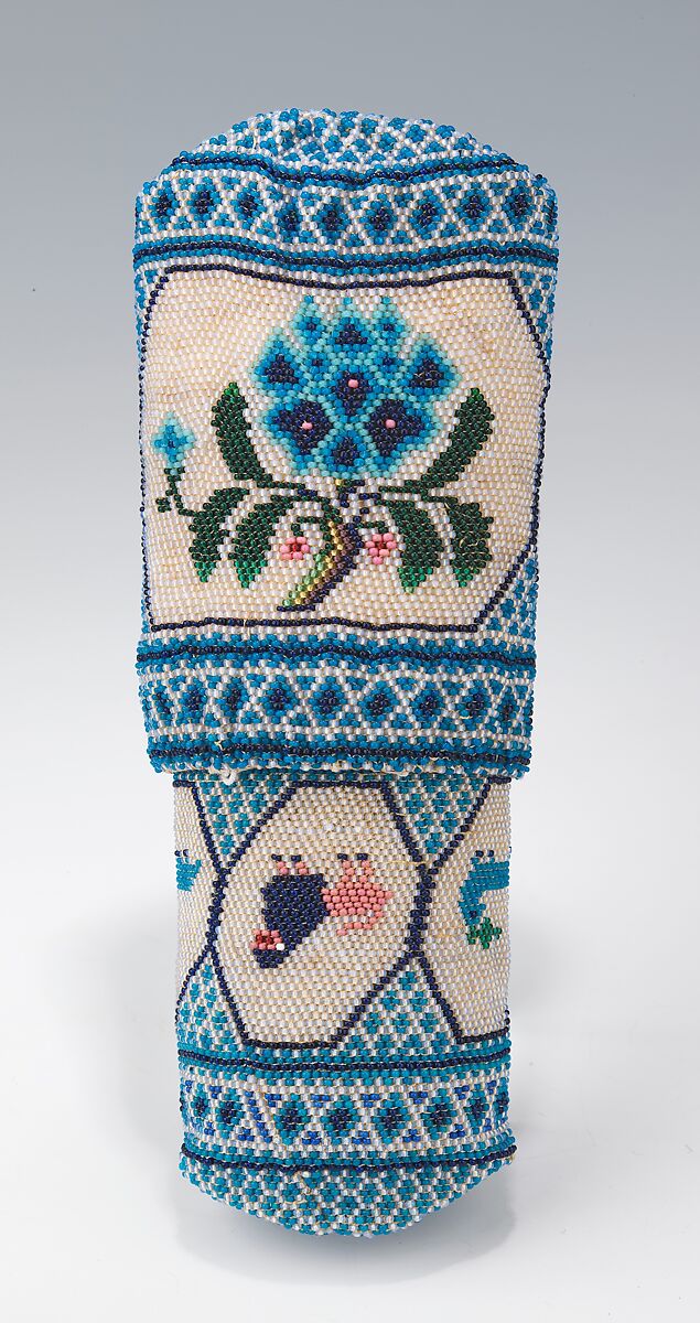 A good example of elaborate beadwork, this Mexican purse features a remarkable amount of detail. The alternating animal forms on the bottom half and tent-stitch-like flower at the top require considerable skill to execute. The bag is fully lined with a printed textile and is part of the Mexican beadwork collection of over 600 pieces assembled by Elizabeth Morrow (1873-1955), mother of writer Anne Morrow Lindbergh, the wife of renowned aviator Charles Lindbergh. Morrow collected the objects between 1927 and 1930, when her husband, Dwight Morrow, Sr., served as U.S. ambassador to Mexico. She lent the collection to the Brooklyn Museum in 1938 and upon her death, her children donated it. A collection of 155 pieces of Mexican ceramics and other decorative arts were given to Amherst College, her husband's alma mater.