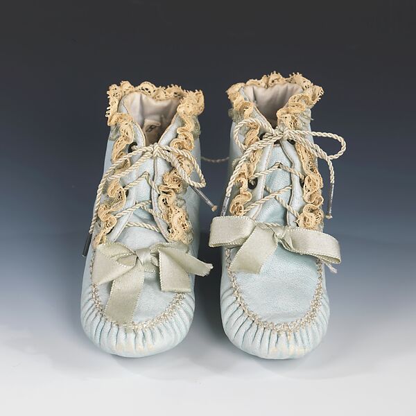 The exuberant embellishment of these two pairs of infant's booties expresses the style of 1890s, when rich ornament was featured in many areas of the decorative arts. Booties of this type would have been worn for presentation purposes, at a christening or some such important event. They are beautifully crafted throughout, including the lining, and feature decorative stitching at the toe seam and meticulously executed lace ruffles. The two pairs were worn by the same baby girl, demonstrating that our current rule of blue for boys and pink for girls was not yet codified at the turn of the century. Prior to this time, pink had been favored as a more vigorous color suitable for boys and blue as a passive color suitable for girls. Despite the ambiguous color coding system, the blue pair here does feature an external lacing rather than a ribbon bow, a simple bow knot in place of the rosette, and exclusion of embroidery, all elements which give the booties a more masculine appearance.